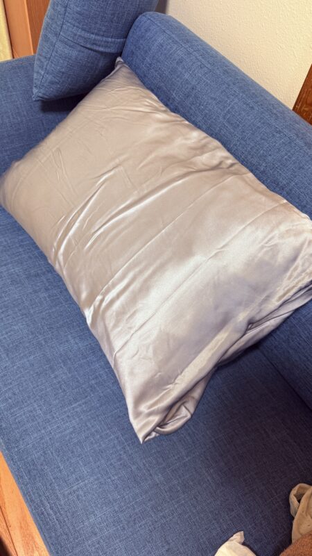 シルクサテンのクッションとカバーをカスタムオーダーで作成していただきました。現在は枕本体にシルバーの枕カバーを重ねて使っています。とても柔らかく、触れた瞬間にふわっと包み込まれるような心地よさがあります。